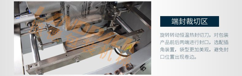 5、端封裁切区:旋转转动恒温热封切刀,对包装产品前后两端进行封口,选配插角装置,袋型更加美观,避免封口位置出现卷边。
